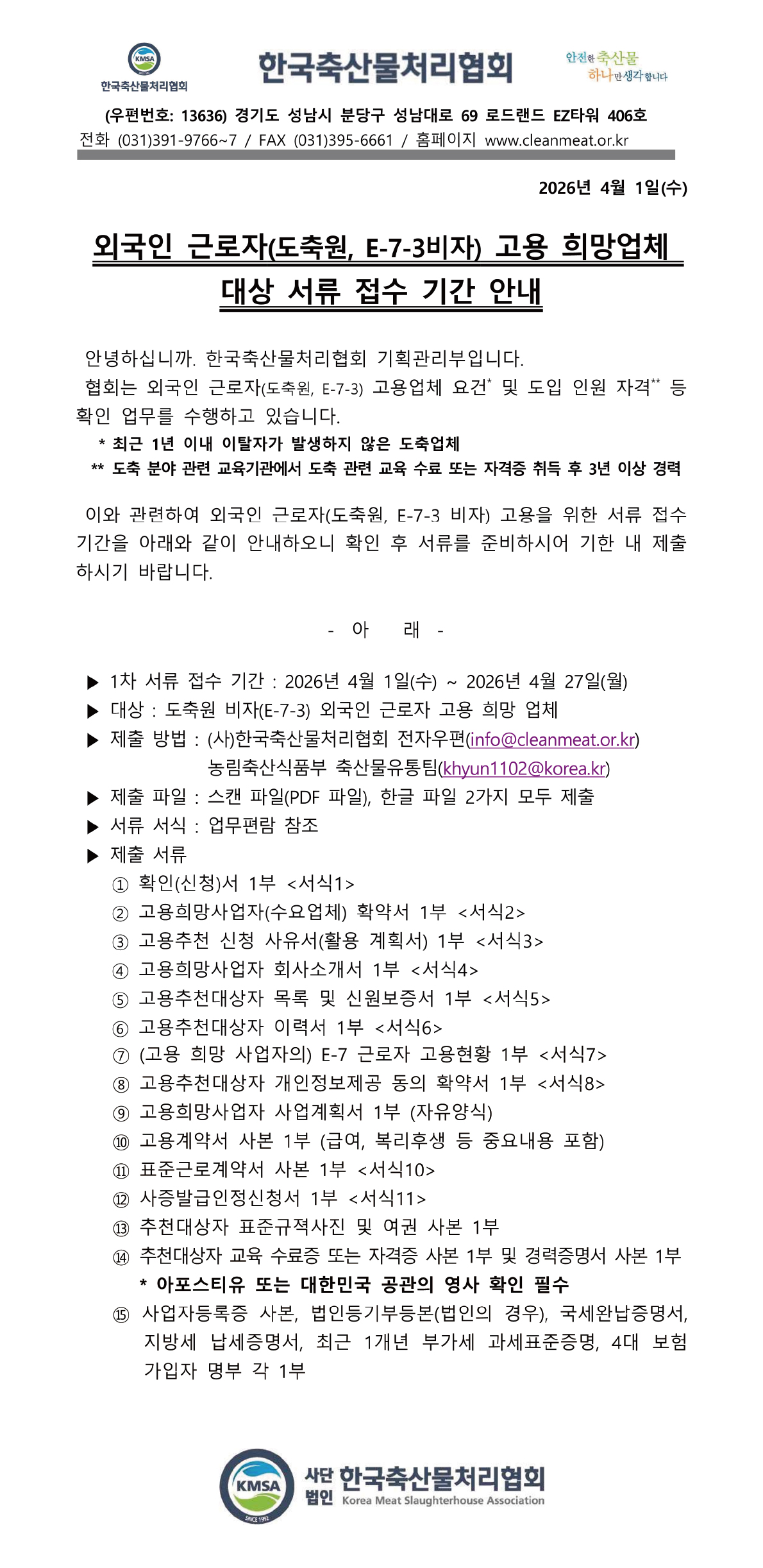 외국인 근로자(도축원, E-7-3비자) 고용 희망업체 대상 서류 접수 기간 안내(~ 4월 27일(월) 까지)