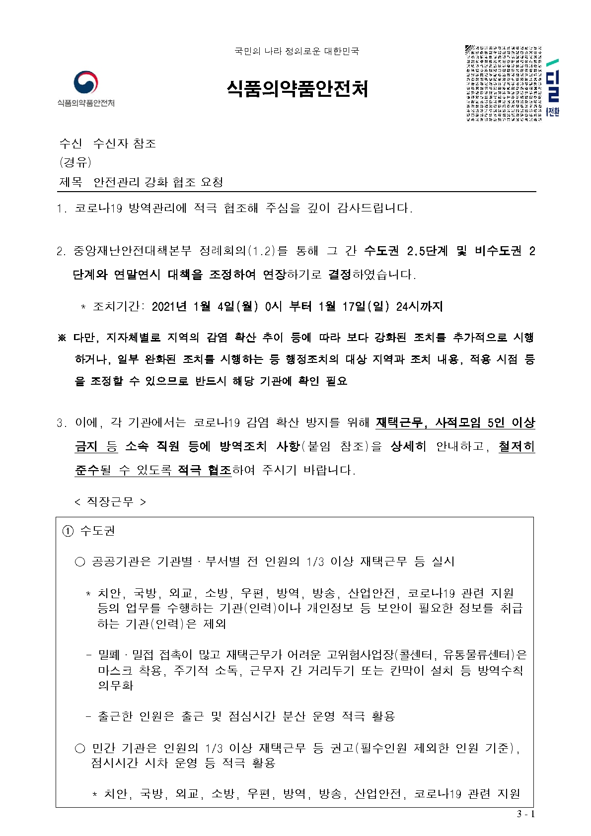 (코로나19) 안전관리 강화 협조(21.01.03., 식품의약품안전처)