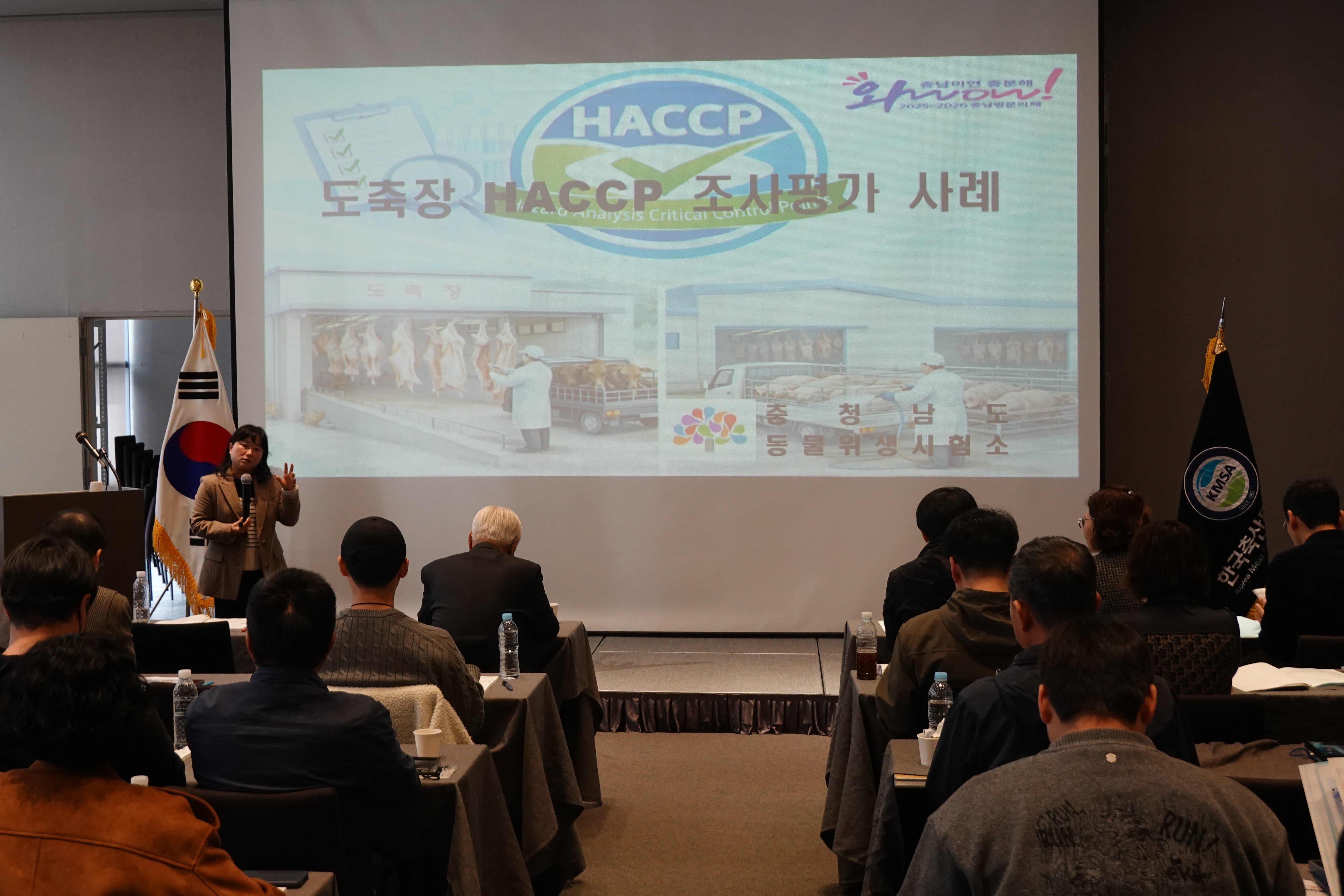 두 번째 강의는 충청남도 동물위생시험소 박효선 과장이 ‘도축장 HACCP 운용 조사·평가 사례’를 주제로 평가항목과 현장 사례, 주요 지적사항 등을 중심으로 점검 항목에 대해 강의했습니다.