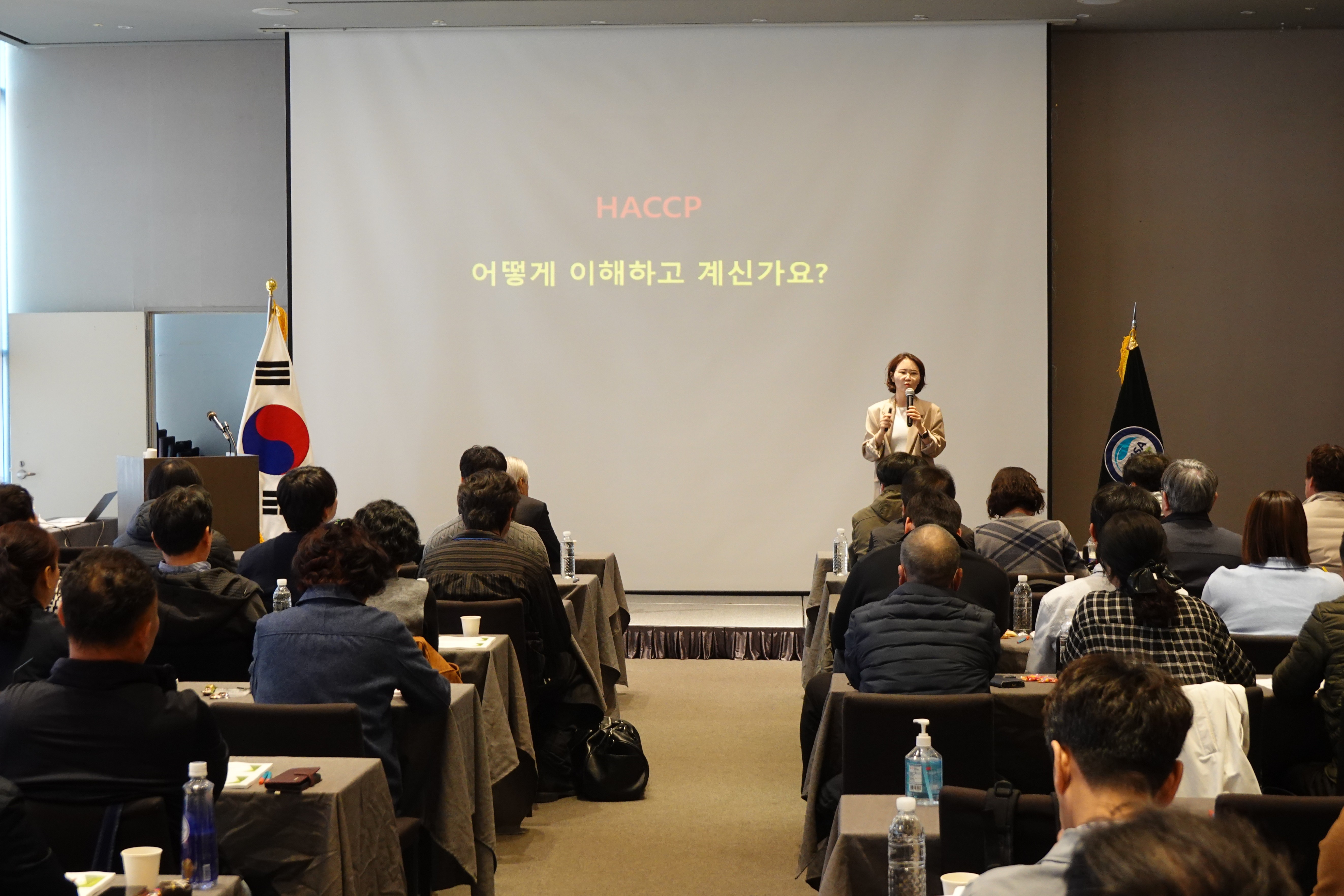 첫 번째 강의는 농림축산식품부 이민혜 사무관이 ‘원 헬스 기반의 도축공정과 도축장의 식품 안정성’을 주제로 축산물 위생관리법에 따른 도축장 HACCP 관리기준서 작성 방법, HACCP PLAN 수립, 도축공정별 SOP 관리 등 도축장 생산관리 전반에 대해 강의했습니다