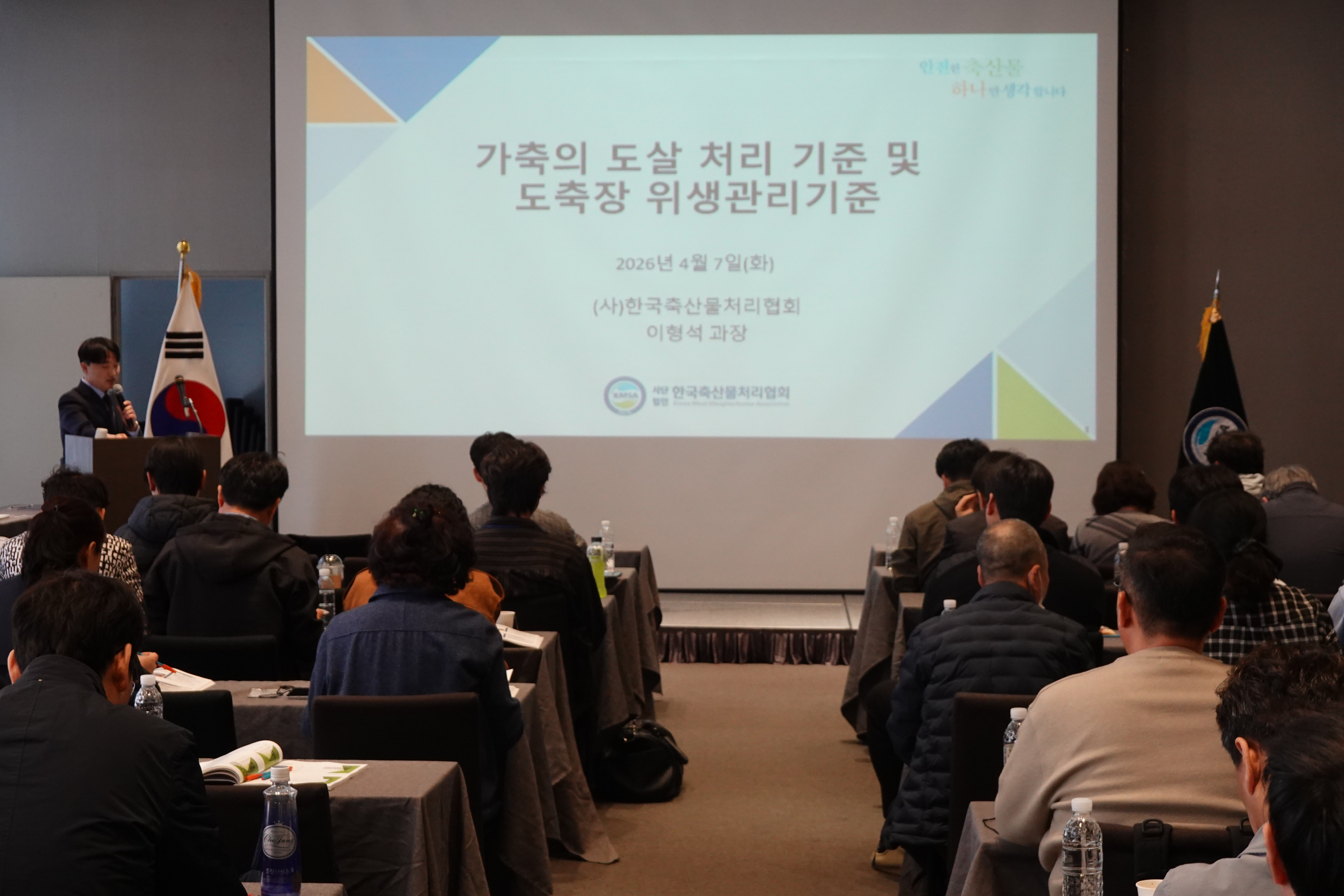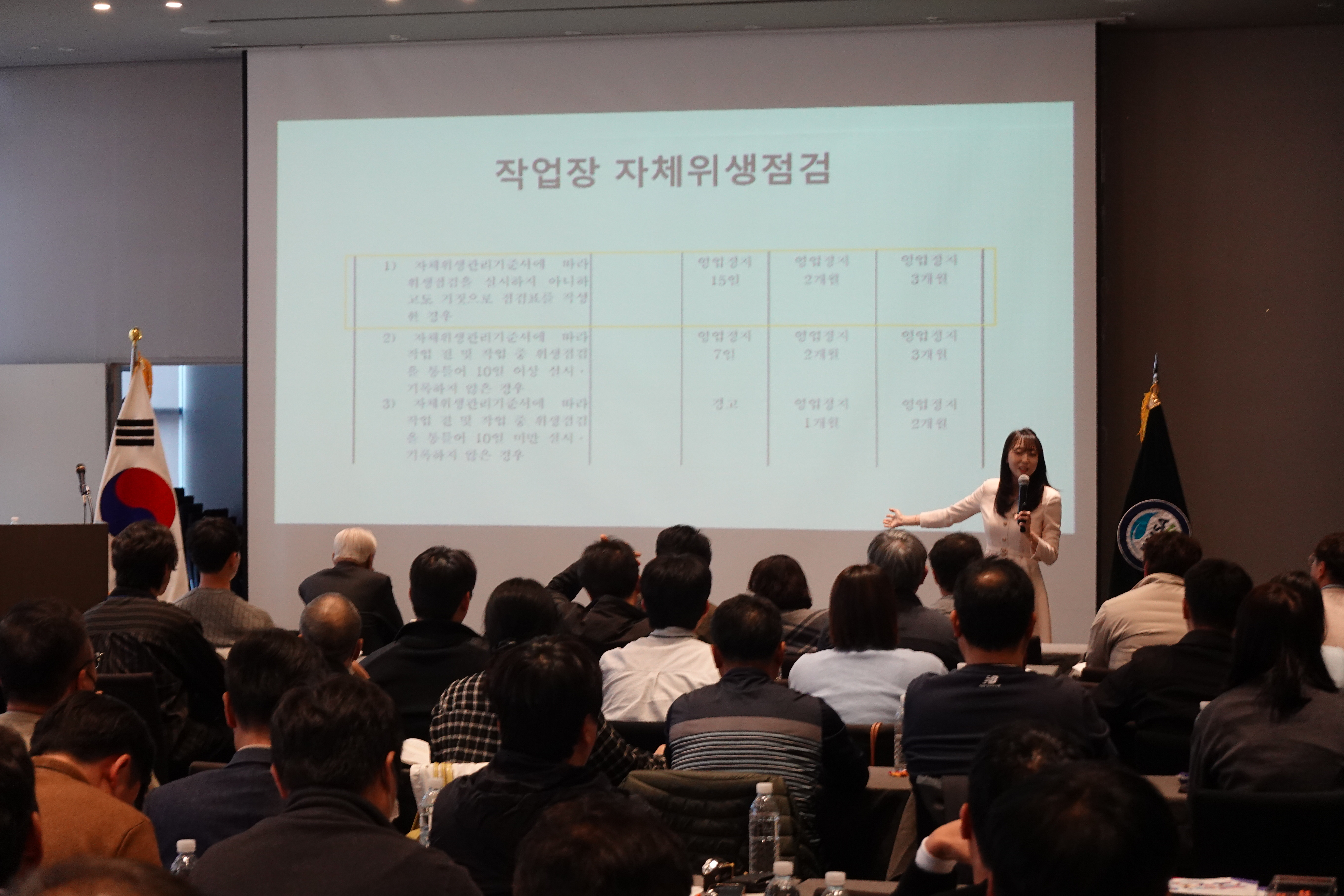 두 번째 강의는 한국축산물처리협회 이형석 과장이‘가축의 도살 처리 기준 및 도축장 위생관리기준’을 주제로 축산물 위생관리법 시행규칙 [별표 1, 2] 에 대한 주요 내용과 관련 행정처분 등 도축장 관련 법령에 대해 강의했습니다.